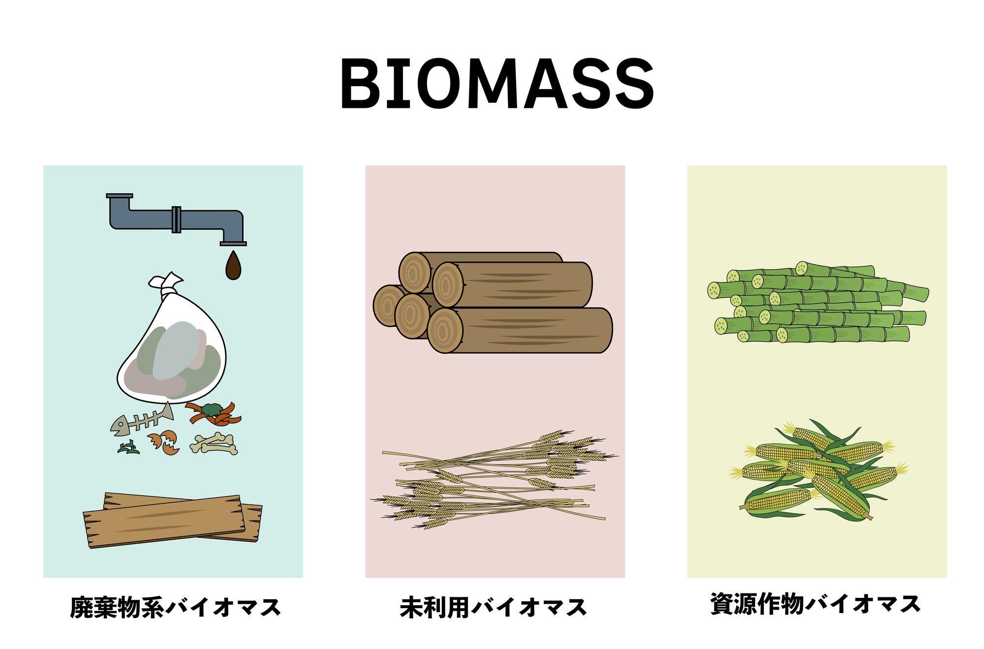 バイオマスは、「廃棄物系バイオマス・未利用バイオマス・資源作物」の3つに大別されており、建設発生木材や林地残材、食品廃棄物、菜種(油脂)など全て有機資源であるところが特徴です。